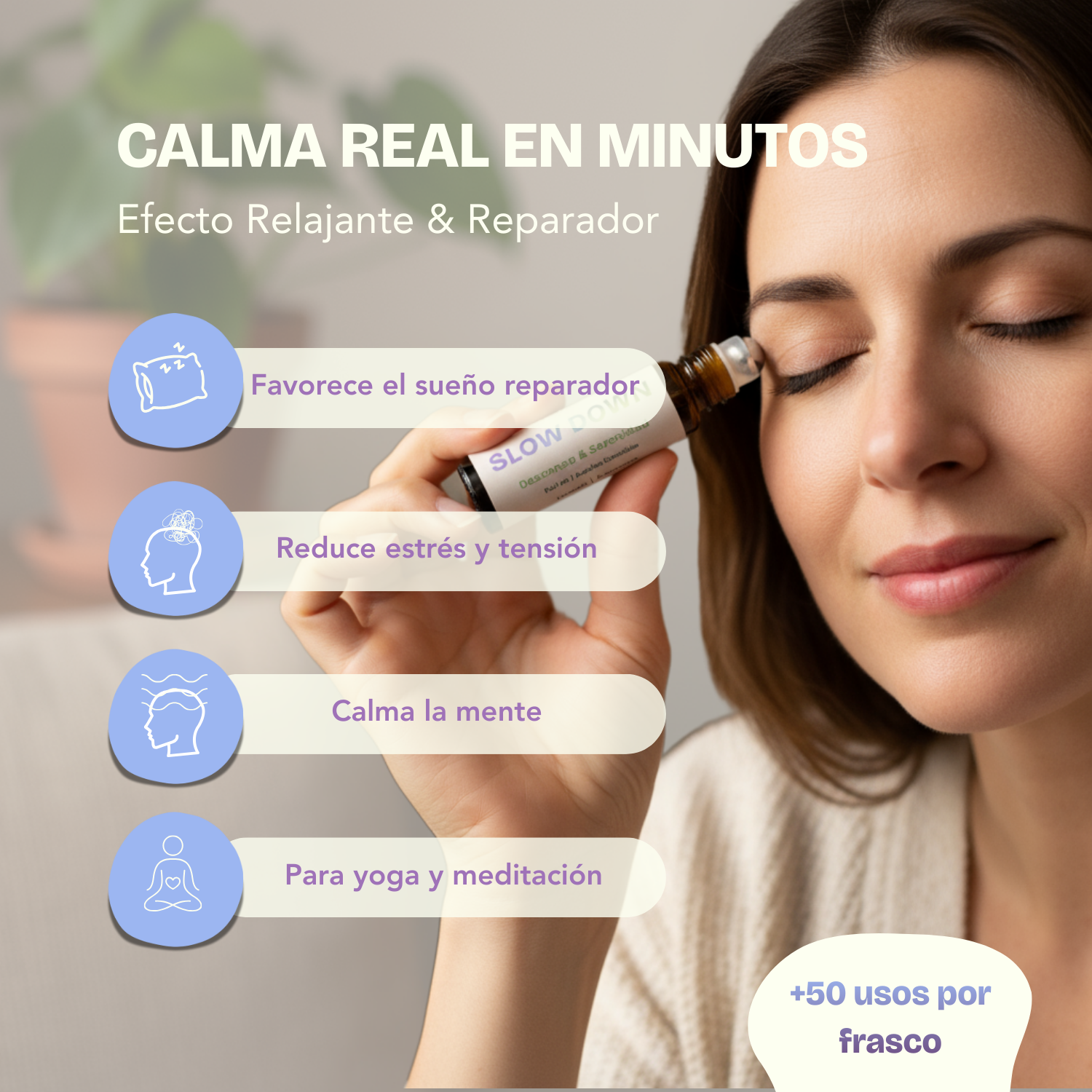 No funciona como un sedante ni es un medicamento para dormir. Slow Down crea una atmósfera de calma, ayuda a bajar el ruido mental y a preparar el terreno para un descanso más reparador. El efecto real aparece cuando lo integras como ritual: respiraciones profundas, luz más baja, menos pantallas y un poco de intención.