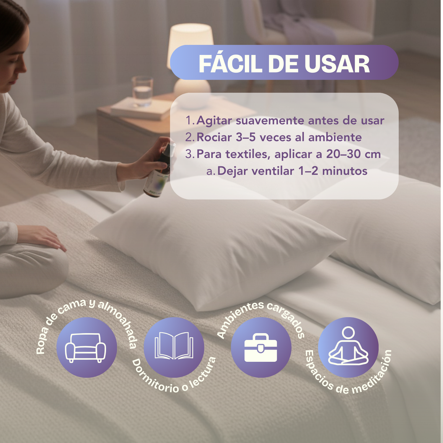 Solo rocías a unos 20–30 cm de los textiles, dejas ventilar un par de minutos y permites que el aroma haga su parte.