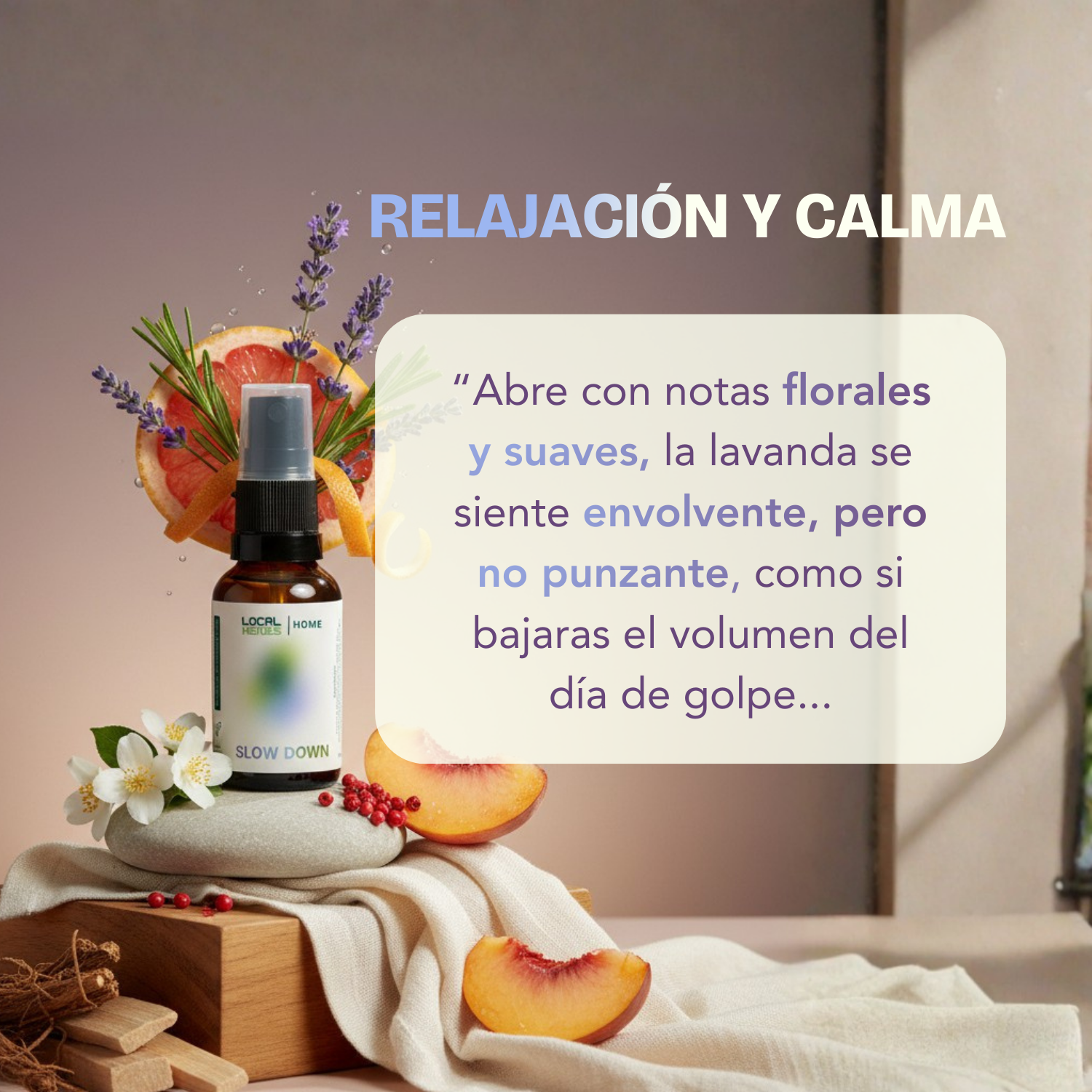 No funciona como un sedante ni es un medicamento para dormir. Slow Down crea una atmósfera de calma, ayuda a bajar el ruido mental y a preparar el terreno para un descanso más reparador. El efecto real aparece cuando lo integras como ritual: respiraciones profundas, luz más baja, menos pantallas y un poco de intención.